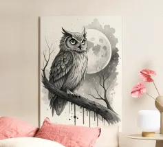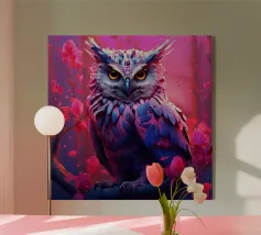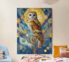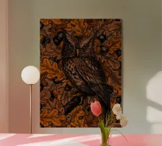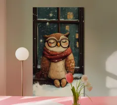 Un'affascinante illustrazione in stile cartoon di un gufo appollaiato con grazia su un ramo d'albero, circondato da vivaci foglie autunnali nelle calde tonalità del rosso, dell'arancio e dell'oro. Il gufo tiene in mano una tazza di sidro fumante, mentre la morbida luce dorata di un tranquillo tramonto illumina la scena. L'ambiente tranquillo e i dettagli stravaganti evocano l'accogliente bellezza dell'autunno.