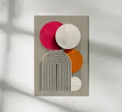 This abstract Bauhaus inspiration combines geometry and symmetry in a modern design. With white circles, semi-circles and stripes in grey, orange and pink, the illustration creates a harmonious interplay of colours. The retro striped architectural shapes give the artwork a minimalist and structured aesthetic.