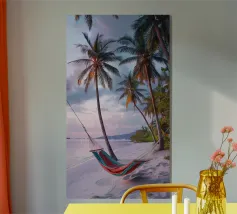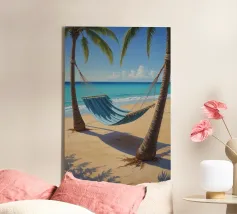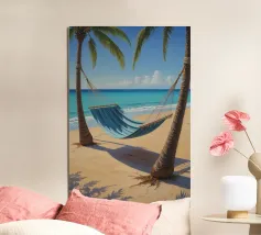 Questo squisito dipinto cattura un perfetto momento di pace su una spiaggia tropicale. Un'amaca dondola pigramente tra due palme, con le invitanti tonalità dell'oceano e del cielo sullo sfondo. La sabbia dorata risplende sotto il sole, mentre le ombre morbide degli alberi esaltano la profondità e il calore della scena. Con la sua magistrale miscela di luce, texture e colore, quest'opera d'arte trasporta in un sereno paradiso costiero, offrendo una tranquilla fuga dalla quotidianità.