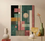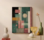 Un sofisticato gioco di forme ed equilibri, questa opera d'arte geometrica astratta combina tonalità tenui di verde acqua, rosa arrossato, senape e crema per creare un senso di calma struttura ed eleganza moderna. Le linee pulite si intersecano con blocchi di colore tenui, formando una composizione ritmica che ricorda il design Bauhaus. Ideale per interni contemporanei alla ricerca di un'estetica architettonica e raffinata.