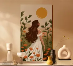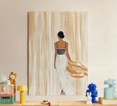 Una donna è raffigurata in morbide onde ondeggianti di tonalità dorate e terrose, che incarnano fluidità e tranquillità. La sua espressione è di dolce contemplazione, mentre si abbraccia in un momento di profonda riflessione. Lo sfondo si integra perfettamente con le sue forme, simboleggiando l'interconnessione tra le emozioni umane e la natura. Le pennellate calde e delicate creano una sinfonia visiva che evoca un senso di benessere e di appartenenza. Questo dipinto celebra la forza e la sensibilità della femminilità, fondendo l'astrazione moderna con una profondità emotiva senza tempo.