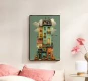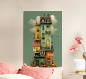 Una casa alta e stravagante immersa nei colori autunnali, che risplende calda sotto la luna piena. Con zucche sui balconi, camini storti, lanterne appese, pipistrelli e sottili ragnatele, questa illustrazione realizzata a mano fonde la magia di Halloween con una narrazione accogliente. Un'opera d'arte da parete audace e affascinante che evoca fantasia e nostalgia stagionale.
