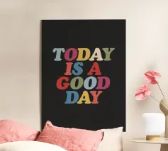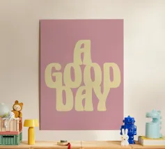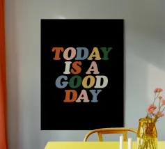 Un design tipografico audace e allegro con la frase edificante "Have a Good Day" in lettere grandi, grosse e colorate con un effetto semi-opaco su uno sfondo color crema. Questa opera d'arte divertente e positiva è pensata per diffondere gioia e rallegrare qualsiasi spazio. Perfetta per pareti colorate, interni allegri e capi d'abbigliamento che regalano sorrisi a tutti. Ideale per chi ama i disegni vivaci e di grande impatto con un tocco giocoso. Progettato da showmemars