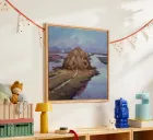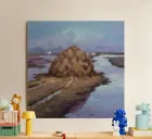 Un dipinto di paesaggio con un grande pagliaio in un campo vicino a un fiume o a uno specchio d'acqua tranquillo. Il cielo è di un grigio tenue e coperto, e la tavolozza generale è sobria con toni terrosi.