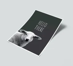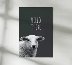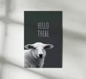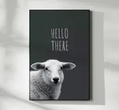 Una buffa pecora e la scritta HELLO THERE in bianco e nero.