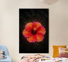 Un'opera d'arte digitale straordinaria presenta un fiore di ibisco rosso vivo circondato da spruzzi dinamici di vernice verde e gialla. Il movimento vorticoso e le texture fluide creano una composizione artistica ed energica che unisce la natura all'espressionismo astratto.