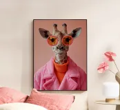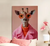 Un ritratto surreale ma elegante di una giraffa vestita in modo audace: un cappotto di pelliccia sintetica rosa, un vivace dolcevita arancione e occhiali da sole retrò oversize. Questa opera d'arte antropomorfa combina umorismo, eleganza e moderno surrealismo pop, creando un pezzo giocoso ma sofisticato. Ideale per interni eclettici, studi creativi o pareti di gallerie, questa stampa conferisce personalità, colore e un tocco di moda assurda a qualsiasi spazio.