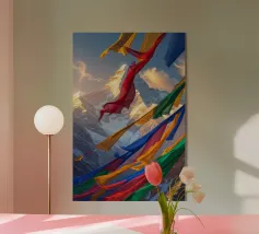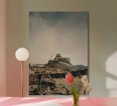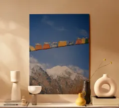 Un sorprendente contrasto tra la devozione umana e la grandezza della natura: il tetto di un monastero ornato d'oro e turchese si protende verso le imponenti cime innevate dell'Himalaya. L'intricato lavoro artigianale riflette la profonda spiritualità della regione, armonizzandosi con l'eterna presenza delle montagne. Catturata lungo il Circuito dell'Annapurna, questa immagine racchiude l'essenza della ricca cultura e dei paesaggi mozzafiato del Nepal.