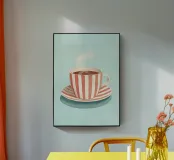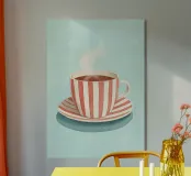 Questa affascinante natura morta cattura un momento di confortante calore con una tazza fumante di caffè o di cacao. La tazza e il piattino presentano un allegro motivo a strisce verticali bianche e rosse di ispirazione vintage, che conferisce al pezzo un'atmosfera divertente e nostalgica. Sullo sfondo di un rilassante blu pastello, il contrasto è sottile ma d'effetto. Questa illustrazione stravagante incarna perfettamente l'estetica Cafécore e l'accogliente tendenza Hygge, rendendola un pezzo ideale per la cucina, la sala da pranzo o l'angolo del caffè. La texture morbida e dipinta aggiunge profondità e intimità. Provate l'eccellenza dell'arte digitale di alta qualità. Questo d