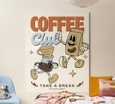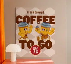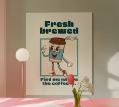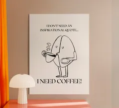 Una tazzina da caffè e un personaggio a forma di cuore sono raffigurati mentre si tengono per mano con la scritta "Ho bisogno di una sola cosa per riscaldare il mio cuore, il caffè".