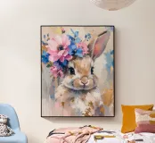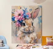 Questo design moderno presenta un simpatico coniglio con fiori sulla testa. Disegnato con delicati acquerelli e accenti dorati, unisce la bellezza naturale all'eleganza artistica. Le morbide sfumature di colore e lo stile astratto conferiscono a qualsiasi ambiente un'atmosfera romantica e giocosa, ma allo stesso tempo elegante: un vero e proprio colpo d'occhio per la vostra casa.