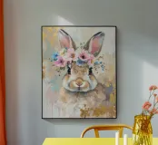 Questo design moderno presenta un simpatico coniglio con fiori sulla testa. Disegnato con delicati acquerelli e accenti dorati, unisce la bellezza naturale all'eleganza artistica. Le morbide sfumature di colore e lo stile astratto conferiscono a qualsiasi ambiente un'atmosfera romantica e giocosa, ma allo stesso tempo elegante: un vero e proprio colpo d'occhio per la vostra casa.