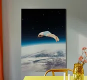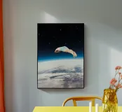 Un collage surreale che fonde il corpo umano con la vastità cosmica. Un tuffatore sospeso sopra la Terra trasforma il salto in una metafora di coraggio, libertà ed esplorazione dell'ignoto. Il contrasto tra la figura atletica e il cosmo infinito crea un'immagine suggestiva che unisce minimalismo e immaginazione onirica. Perfetto per chi apprezza l'arte moderna con un tocco surreale e cosmico.