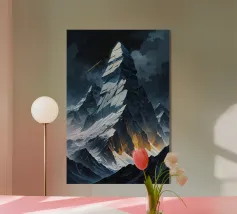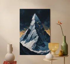 Quest'opera d'arte celebra il K2 concentrandosi sui suoi strati unici e illuminati. La luce cattura i modelli angolari e le formazioni geometriche della vetta, creando una miscela armoniosa di realismo e astrazione. I forti contrasti tra le superfici illuminate dal sole e le creste in ombra conferiscono alla montagna un'eleganza architettonica, preservandone la cruda essenza naturale. Questa suggestiva composizione ricorda lo status di icona del K2, sia come meraviglia geografica che come musa artistica.