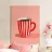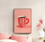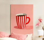 Illustrazione di una tazza di caffè con strisce rosse e bianche su sfondo rosa. Design piatto e minimalista con forme semplici, disegno a mano e texture a guazzo. Stile giocoso di ispirazione vintage, che ricorda le illustrazioni dei libri per bambini e trasmette un'atmosfera allegra ed estetica.