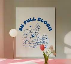Strahle Positivität und Coolness aus mit dem Design „In Full Bloom“! Dieses Retro-Motiv zeigt eine augenzwinkernde Cartoon-Blume, die entspannt liegt, mit einer Hand das Peace-Zeichen macht und ein schelmisches Lächeln trägt. Die minimalistischen Linien und der monochrome Look in Blau verleihen dem Design einen zeitlosen, stilvollen Charme – perfekt für alle, die das Leben in vollen Zügen genießen.