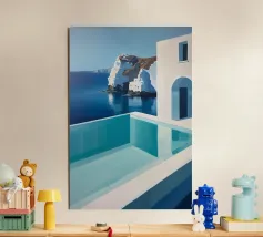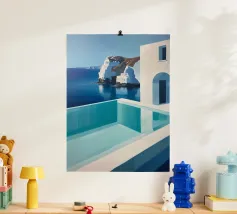 This serene modern minimalist oil painting captures the tranquility of an infinity pool seamlessly merging with the calm, deep blue sea. The backdrop features dramatic white cliffs kissed by soft sunlight, casting subtle reflections in the water. The geometric architecture complements the natural scene, creating a harmonious balance between structure and wilderness. The absence of human presence amplifies the peaceful solitude, inviting viewers into a meditative, dreamlike space filled with serenity and awe.