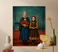 Ingrid, with the winter in her eyes, Holds a poppy, crimson against the grey skies. A cat, white as snow, rests upon her head, While unspoken sorrows in her heart are bred. The world sleeps in hues of petrol and rust, A silent promise whispered in the dust. She breathes the cold, a fragile, fleeting sigh, As dormant dreams drift quietly by.
