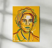 Un ritratto astratto intenso e colorato creato con linee audaci ed espressive in giallo, rosso e blu, che cattura un'emozione umana cruda ed energica con una qualità moderna, simile a uno schizzo.