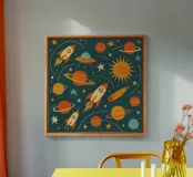 Embark on a cosmic journey with this captivating space-themed wallpaper design. Featuring vibrant rockets, colorful planets, and radiant stars, this artwork brings the wonders of planetary exploration into your home. Perfect for nurseries, playrooms, or any space enthusiast’s domain, this eye-catching design sparks imagination and curiosity. Create an inspiring environment that invites adventure and discovery, awakening dreams of interstellar travel and astronomical exploration.