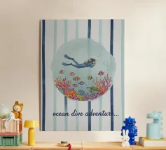 Dive into the deep blue with this captivating scuba diving poster! This colorful illustration features a diver exploring a vibrant coral reef, surrounded by tropical fish, a majestic manta ray, and a jellyfish. It's the perfect ocean souvenir for sea lovers and diving enthusiasts. This retro print brings the beauty of the underwater world to your home. A fantastic travel lover gift that adds unique coastal decor and a splash of adventure to any room!