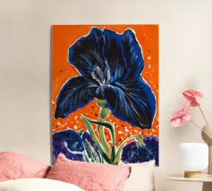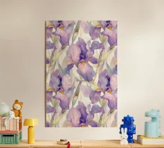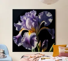 Una rappresentazione dettagliata e vibrante di un singolo fiore di iris in piena fioritura, che mostra i suoi intricati petali nei toni del blu, del viola, del bianco e del giallo. L'attenzione si concentra sulla maestosa bellezza del fiore.