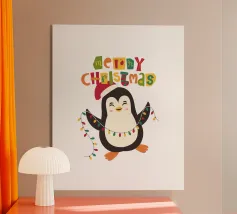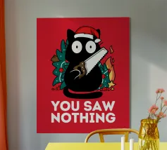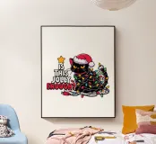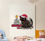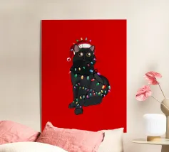 Un gatto nero che indossa un cappello da Babbo Natale è spiritosamente impigliato in luci natalizie colorate. Il testo accanto al gatto recita: "È abbastanza allegro?".