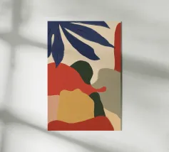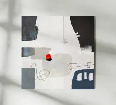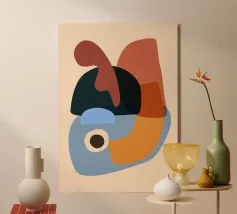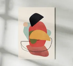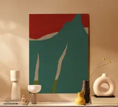 Vivace opera d'arte astratta minimalista. Il contrasto tra il rosso acceso e il verde scuro crea un'intrigante dinamica visiva. L'aggiunta delle tre forme arancioni luminose vicino al centro aggiunge un punto focale e migliora la composizione complessiva. Questa opera d'arte minimalista combina semplicità e complessità.