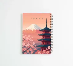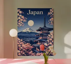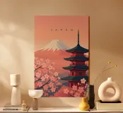 Minimalist Japanese design with the famous snow-capped volcano Fuji and a temple during the cherry blossom in the foreground. Typical Japanese landscape and impressive mountain.