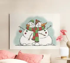 Un allegro pupazzo di neve e un omino di pan di zenzero si trovano accanto a una grande scritta rossa "JOY" ornata da fiocchi di neve e circondata da decorazioni natalizie. Scatole regalo e ornamenti festosi completano il tema stagionale.