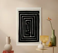 Quest'opera attira lo sguardo in una danza ipnotica di forme nere! Linee spesse e curve e spirali si fondono in un labirinto dinamico su uno sfondo color crema: un gioco di positivo e negativo, movimento e calma. Lo stile è un puro minimalismo organico con pennellate espressive, influenzato dalle silhouette di Matisse e dalla potenza grafica della modernità di metà secolo. Il dipinto crea una profondità meditativa, suscita curiosità ed equilibrio interiore, permettendo allo spettatore di sprofondare nella contemplazione. Per ambienti che richiedono elegante raffinatezza e chiarezza spirituale.