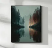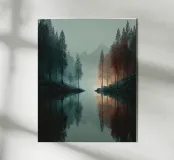 A tranquil, atmospheric landscape defined by perfect symmetry and hushed stillness. A narrow body of water mirrors the surrounding forest, creating a near-seamless reflection that blurs the boundary between land and sky. Cool mist softens the distant mountains while a gentle glow filters through the trees, introducing warmth and contrast without breaking the calm.