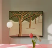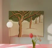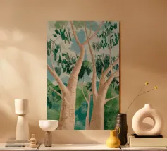 Abstract trees with stylized branches are depicted against a backdrop of muted earth tones. Strong vertical and diagonal lines give the impression of a sparse forest or woodland scene employing a simplified color palette.