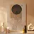 Una composizione geometrica presenta un grande cerchio con archi concentrici, intersecato da linee verticali e ondulate che scorrono su uno sfondo beige e strutturato. L'uso di colori audaci come il nero, il marrone e il rosso crea un contrasto sorprendente. Il disegno ha un'estetica moderna e astratta.