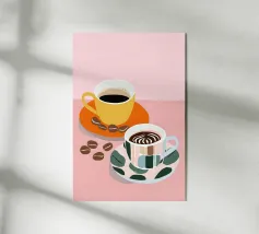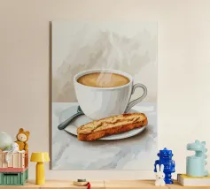 Un cappuccino preparato ad arte con latte art a forma di cuore è al centro di questa calda opera d'arte. La tazza fumante e i chicchi sparsi tutt'intorno creano un'atmosfera accogliente e quasi sensuale. Ideale per chi non si limita a bere il caffè, ma lo celebra. Perfetto per i bar, i baristi o come complemento di stile per la cucina.