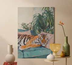 Un'opera d'arte serena e stravagante di un ghepardo che sonnecchia pacificamente su un divano vintage a righe bianche e verdi. I motivi vivaci e la postura accogliente del grosso felino creano un contrasto sognante e spiritoso tra la natura selvaggia e la rilassata vita domestica. Perfetto per gli amanti degli animali, i collezionisti d'arte eclettica e gli appassionati di estetica d'interni giocosa.