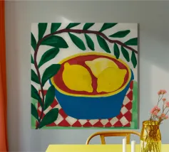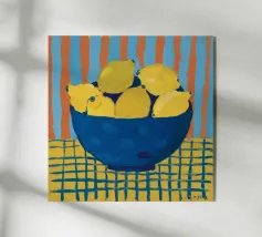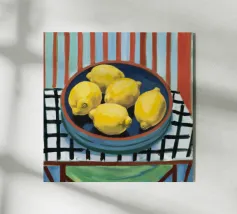 Una moderna natura morta di tre limoni in una scatola, su uno sfondo di foglie verdi e motivi grafici in bianco e nero. La composizione è un mix sorprendente di forme naturali e design grafico.