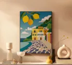 An illustration of a cobblestone pathway in a coastal town, with a beautiful lemon tree heavy with fruit on one side. The scene is a picturesque, sunny, and idyllic depiction of a Mediterranean street.