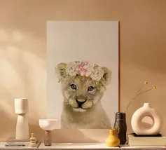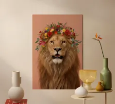 Il ritratto di un leone mostra grandi occhi espressivi e una corona floreale in bianco e nero. La morbida pelliccia è perfettamente enfatizzata in un'illustrazione fotografica minimalista e cattura lo straordinario fascino della natura. Ideale per gli amanti degli animali.