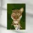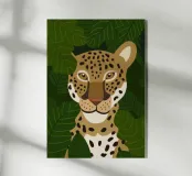 This image depicts a close-up of a leopard's face with a green leafy background. The detailed illustration of the leopard's features makes it visually striking and highlights the beauty of wildlife.
