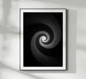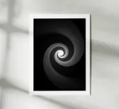 A black and white poster depicting a sculpted spiral leading the eye towards a luminous heart. Mineral texture, soft gradations and deep contrast create an illusion of hypnotic movement, both zen and graphic. This minimalist wall poster adds depth, mystery and modernity to the living room, bedroom or office, and complements contemporary, Scandinavian, industrial or Japandi interiors.