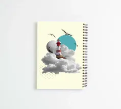 A whimsical and surreal lighthouse collage rising from billowing clouds, surrounded by soaring seagulls and a bold moon backdrop. The red-and-white beacon evokes guidance, hope, and dreamlike adventure. A perfect art print for nautical lovers, dreamers, and modern surrealism enthusiasts.