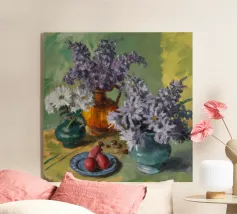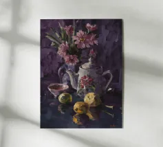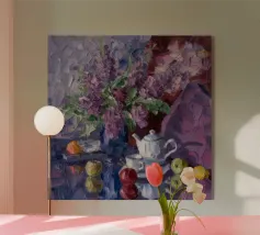 Una natura morta con una brocca d'argento riempita con un rigoglioso bouquet di lillà viola e rosa. Un bicchiere di vino rosso e della frutta si trovano su una superficie scura e lucida che riflette gli oggetti.
