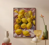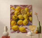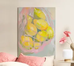 Un vibrante dipinto a olio che cattura un gruppo di limoni freschi in tonalità ricche e illuminate dal sole. La pennellata e i dettagli realistici evocano freschezza e calore, rendendolo una perfetta celebrazione visiva della bellezza degli agrumi e dell'eleganza naturale. Ideale per la cucina o per qualsiasi altro spazio abitativo o lavorativo.