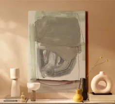 Astrazione gestuale e giocosa di aree di colore libere e linee disegnate in tonalità calde e morbide di verde chiaro, verde kaki, marrone rossiccio, beige e grigio.