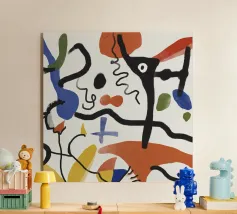 Forme astratte di vari colori sono disposte su uno sfondo neutro, creando un senso di equilibrio e movimento. Linee delicate si intersecano con forme audaci, aggiungendo un interesse visivo dinamico.