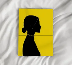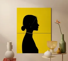 Un ritratto contemporaneo minimalista caratterizzato da forti contrasti e da una precisa linea orizzontale che struttura la composizione. La silhouette nera risalta sullo sfondo giallo vivido, creando un audace equilibrio grafico tra forma e spazio. I contorni puliti e i dettagli sobri conferiscono all'opera un aspetto moderno e sicuro, rendendola un elemento di grande impatto per interni dal design ricercato.