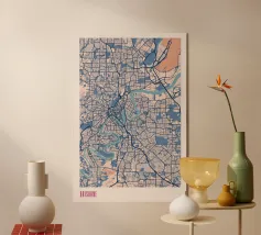Una mappa artistica di Hong Kong che cattura l'armoniosa combinazione di paesaggio urbano e costa con strutture e colori chiari.