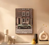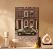 In una pittoresca strada di Londra, un'elegante auto d'epoca passa davanti a facciate di mattoni con un'atmosfera retrò e senza tempo dell'architettura britannica, mescolando storia e nostalgia urbana.