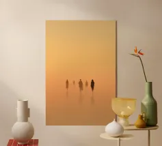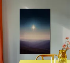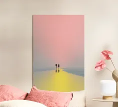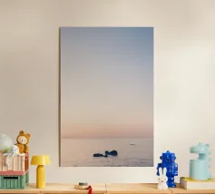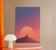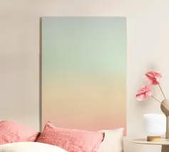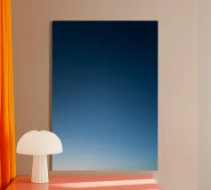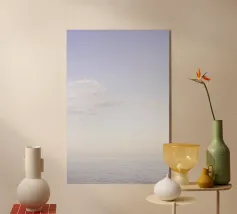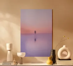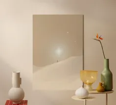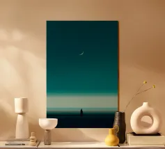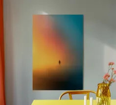 Un albero solitario si erge ai margini di un tranquillo paesaggio da sogno, dove il cielo di colore verde acqua si fonde con un orizzonte beige che sussurra. L'immobilità minimalista di quest'opera d'arte evoca solitudine, introspezione e la sottile forza della natura sospesa nel tempo.